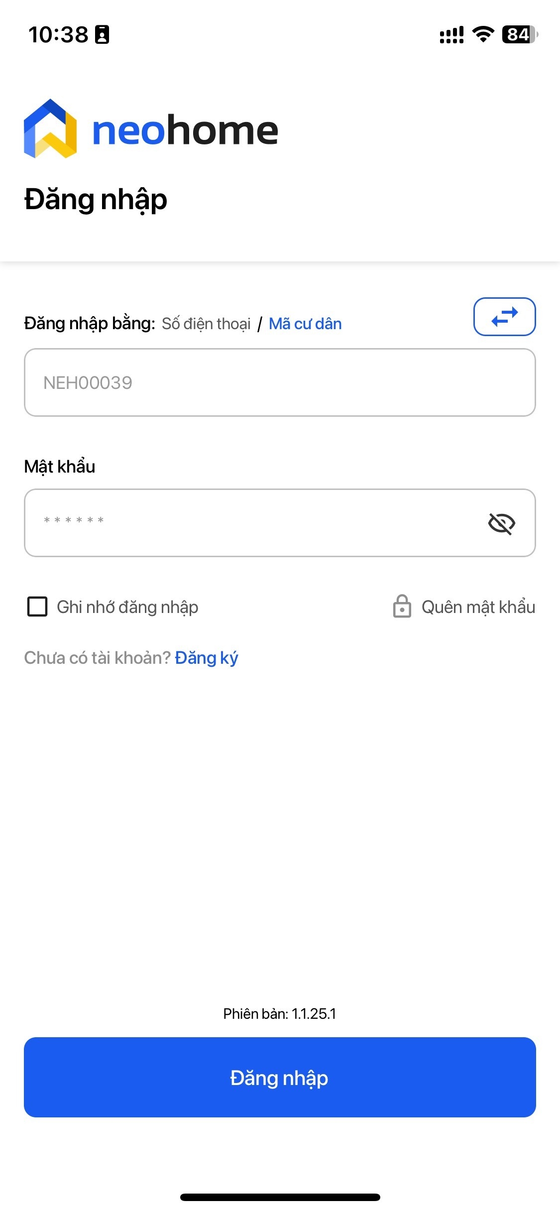Sau khi có thông tin tài khoản > Cư dân quay về Trang đăng nhập > nhập thông tin đăng nhập