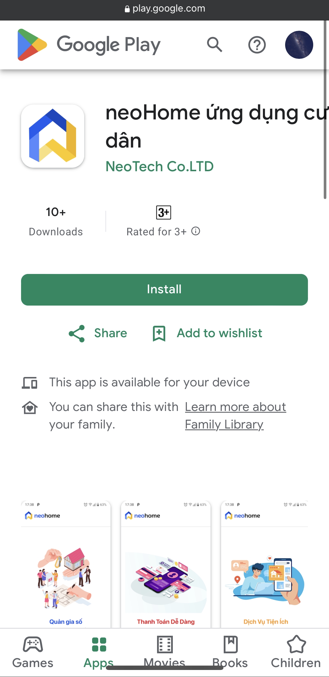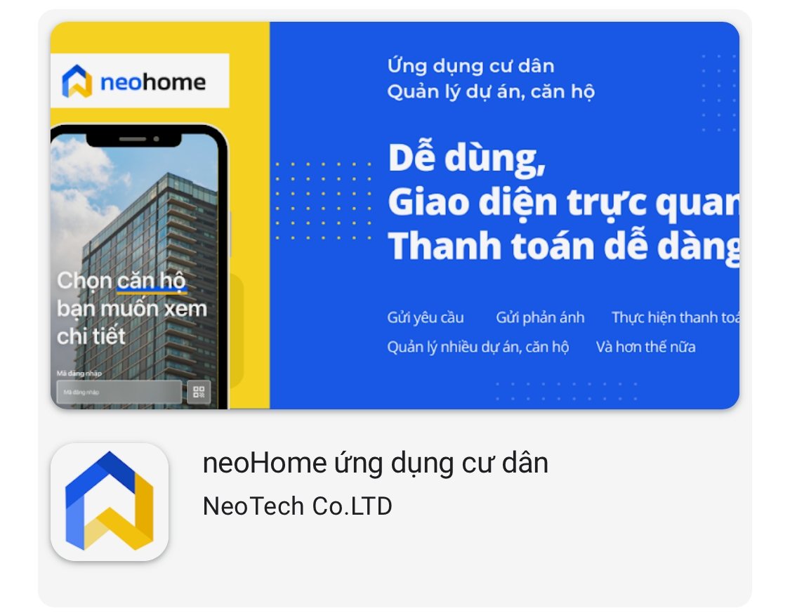 Giao diện sẽ chuyển đến trang tải app neoHome dành cho cư dân trên CH Play Store.